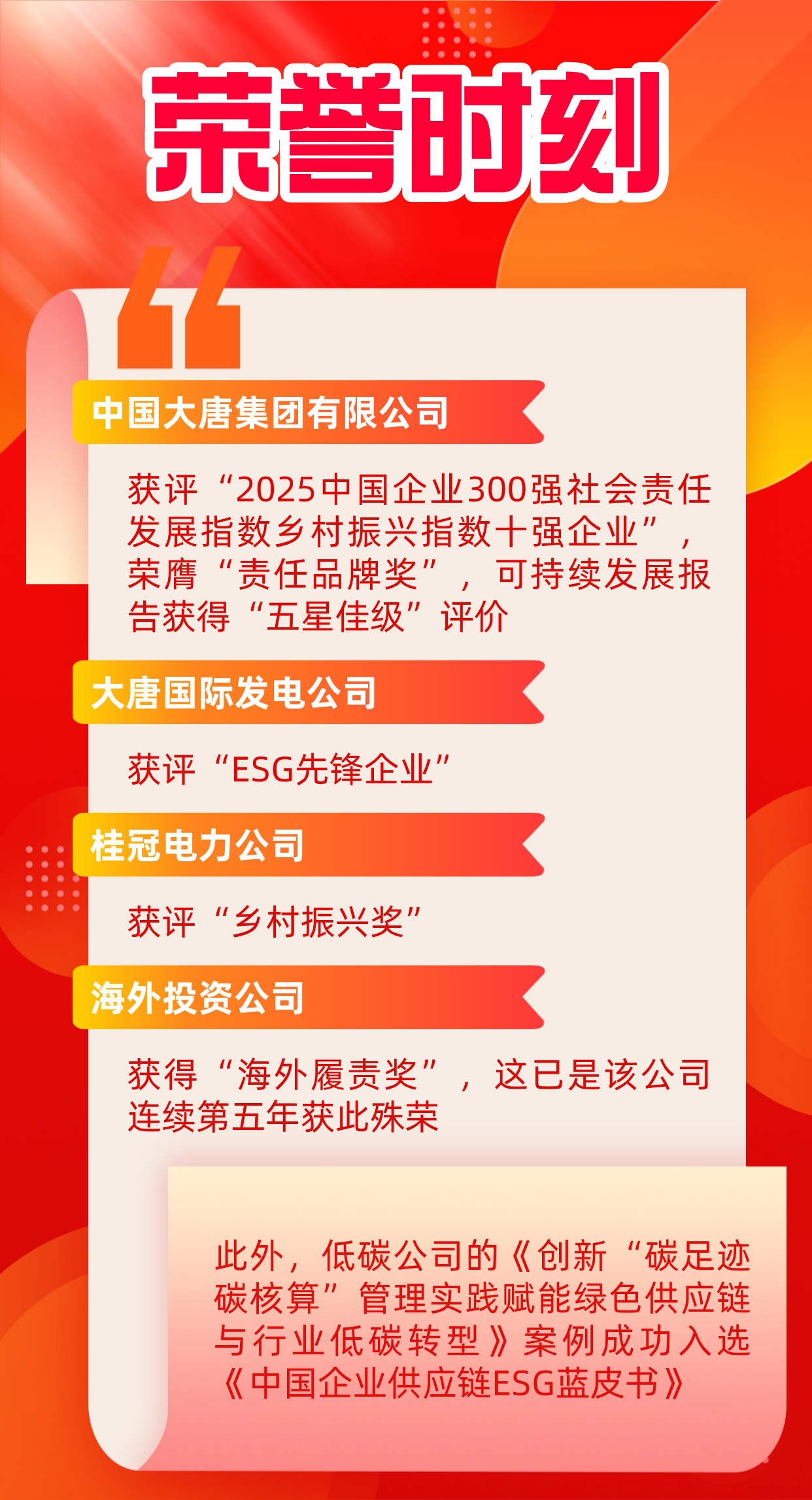 11月20日至21日,“錨定‘十五五’,履責新征程——ESG中國·第八屆北京責任展”在北京成功舉行。活動期間,正式發布《企業社會責任藍皮書(2025)》,舉辦“責任之夜——責任鯨牛獎”頒獎典禮,召開社會責任報告峰會會議。中國大唐斬獲六個獎項,一個優秀案例入選《中國企業供應鏈ESG藍皮書》。