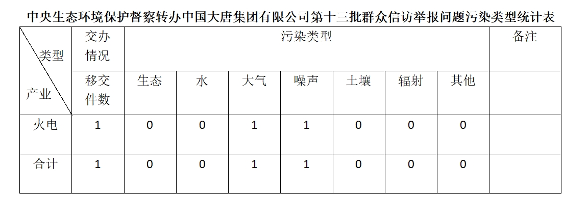 2025年6月19日,中央第七生態環境保護督察組向中國大唐集團有限公司移交第十三批群眾信訪舉報件,共計1件,為來電舉報,涉及大氣問題1個、噪聲問題1個。所有舉報件辦理工作已第一時間進入調查核實辦理程序,辦理情況將按照相關要求反饋督察組,并及時向社會公開。